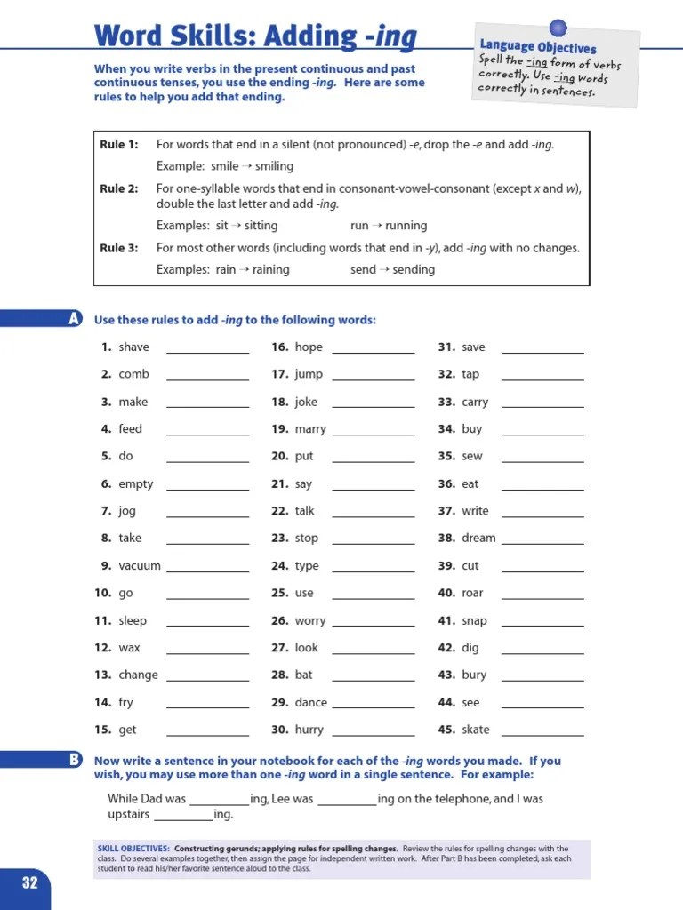 Word Skills Adding ing Spell the ing form of verbs correctly. Use ing words correctly in