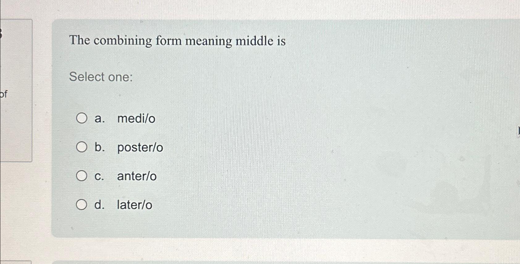 Web Study With Quizlet And Memorize Flashcards Containing Terms Like The Combining Form That Means Middle Is.